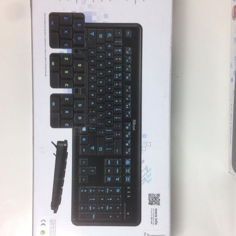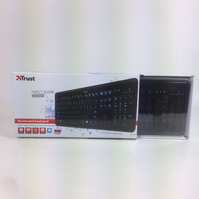 لوحة المفاتيح مع مشرق، وشخصيات الصمام مضيئة على مفاتيح، مقروءا تماما في الظلام.